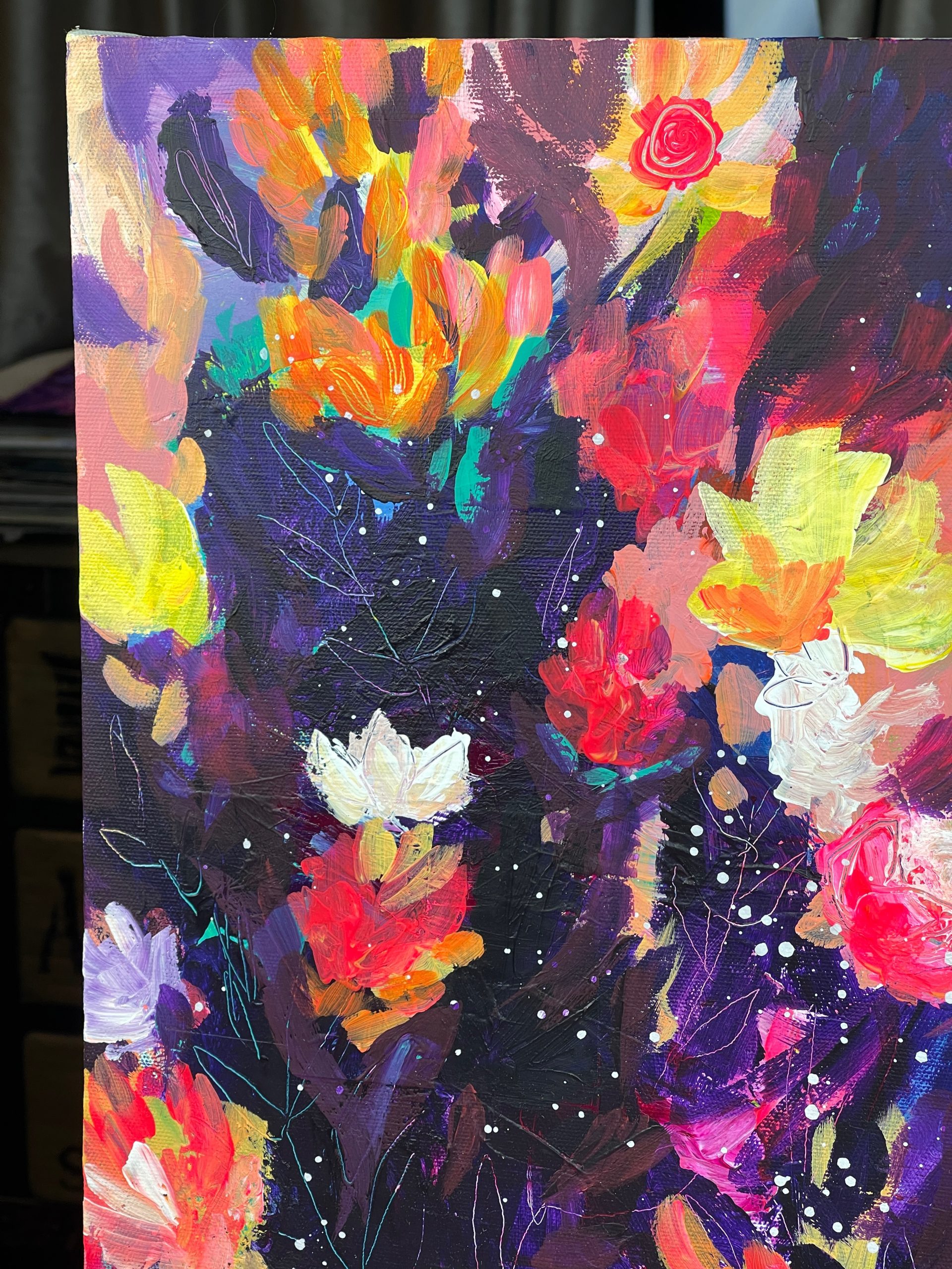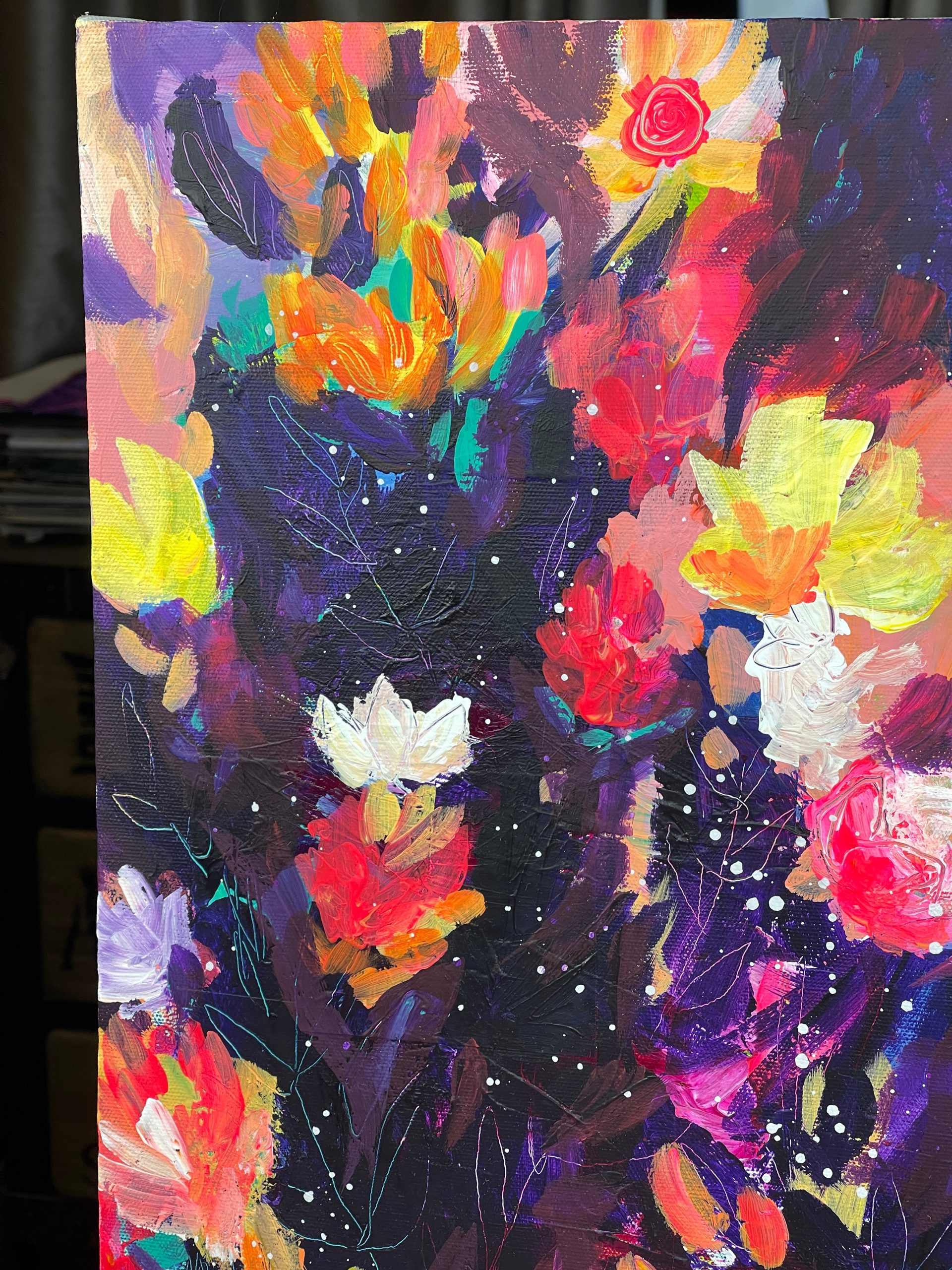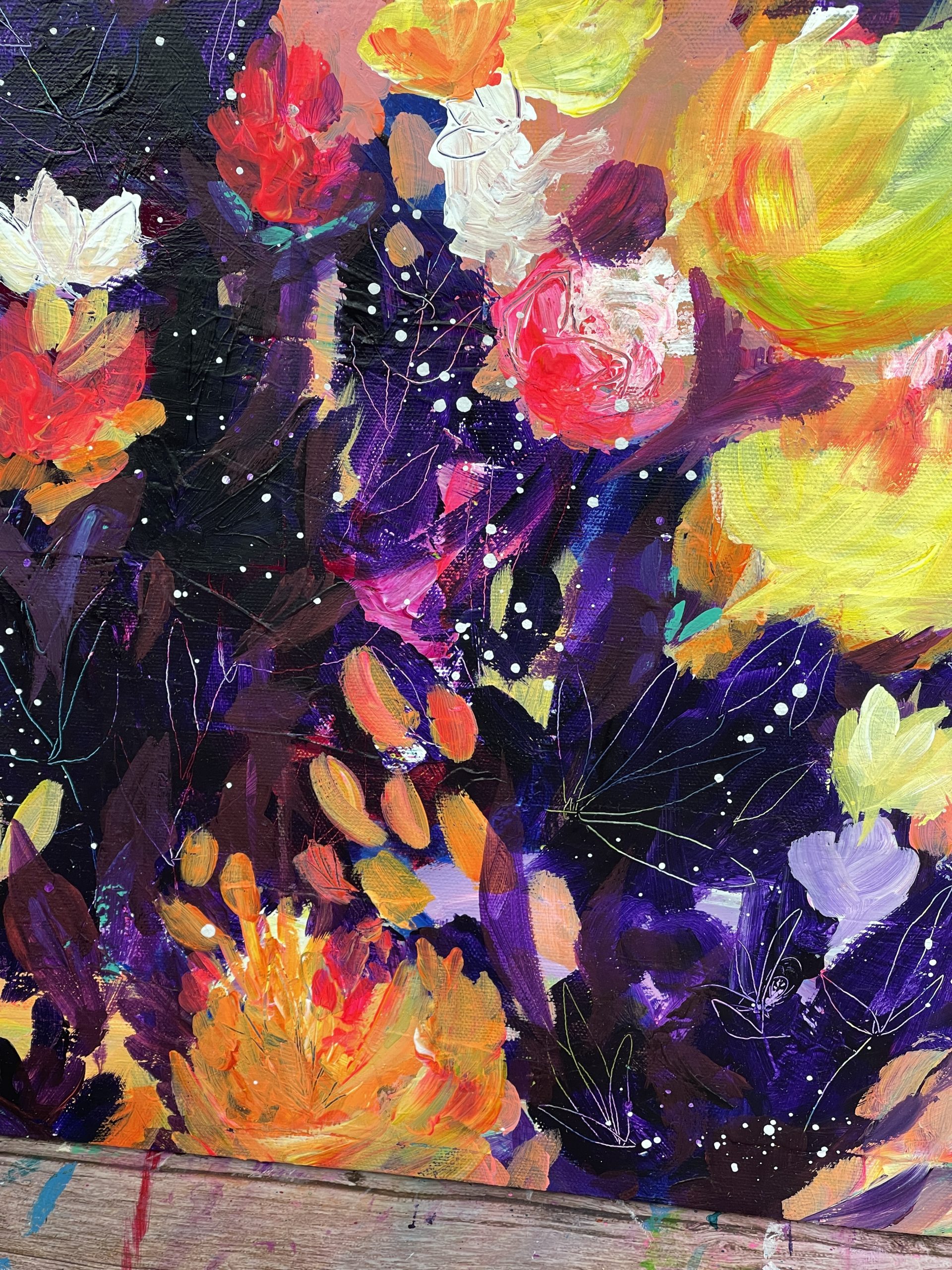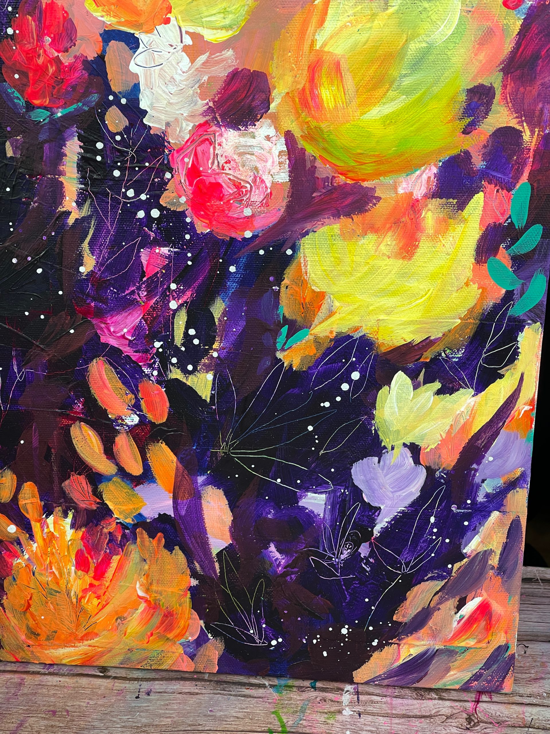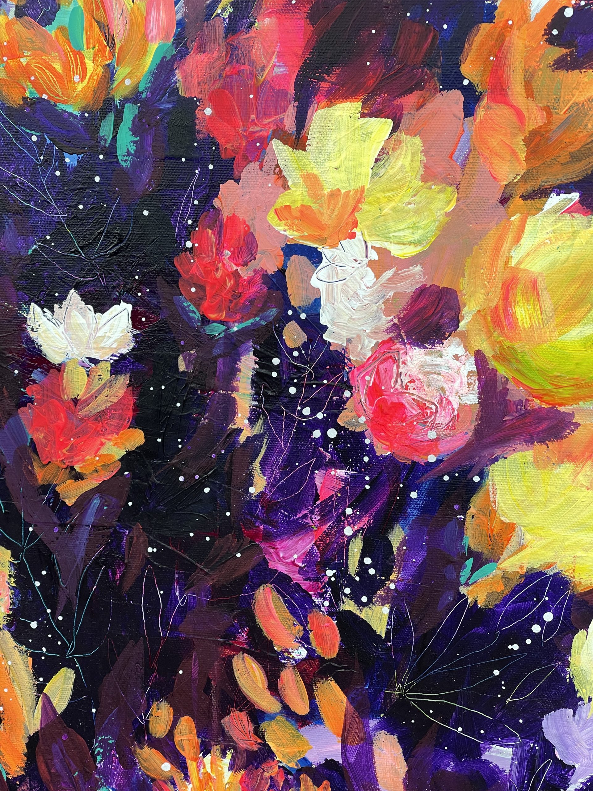 This painting was inspired by the mystery of the night and the wonders that lie within it. This painting features dynamic brush strokes, expressive colours and beautiful marks and textures.