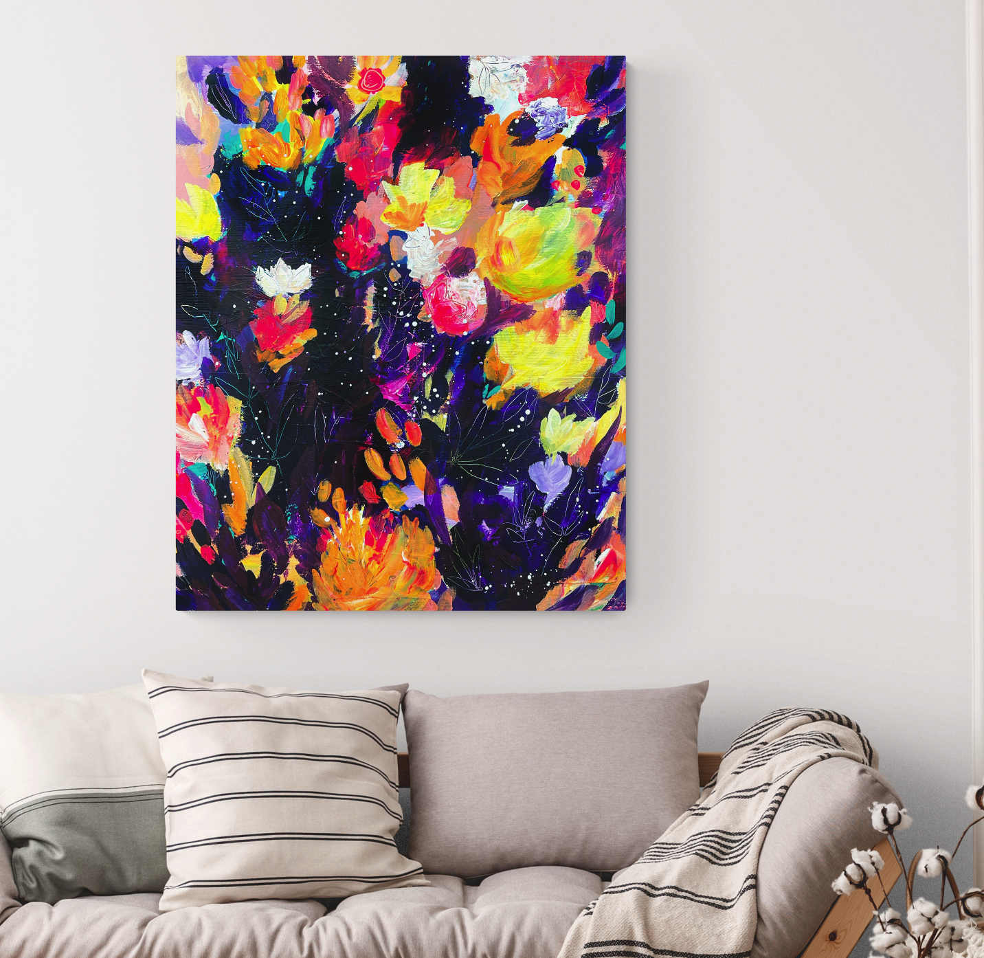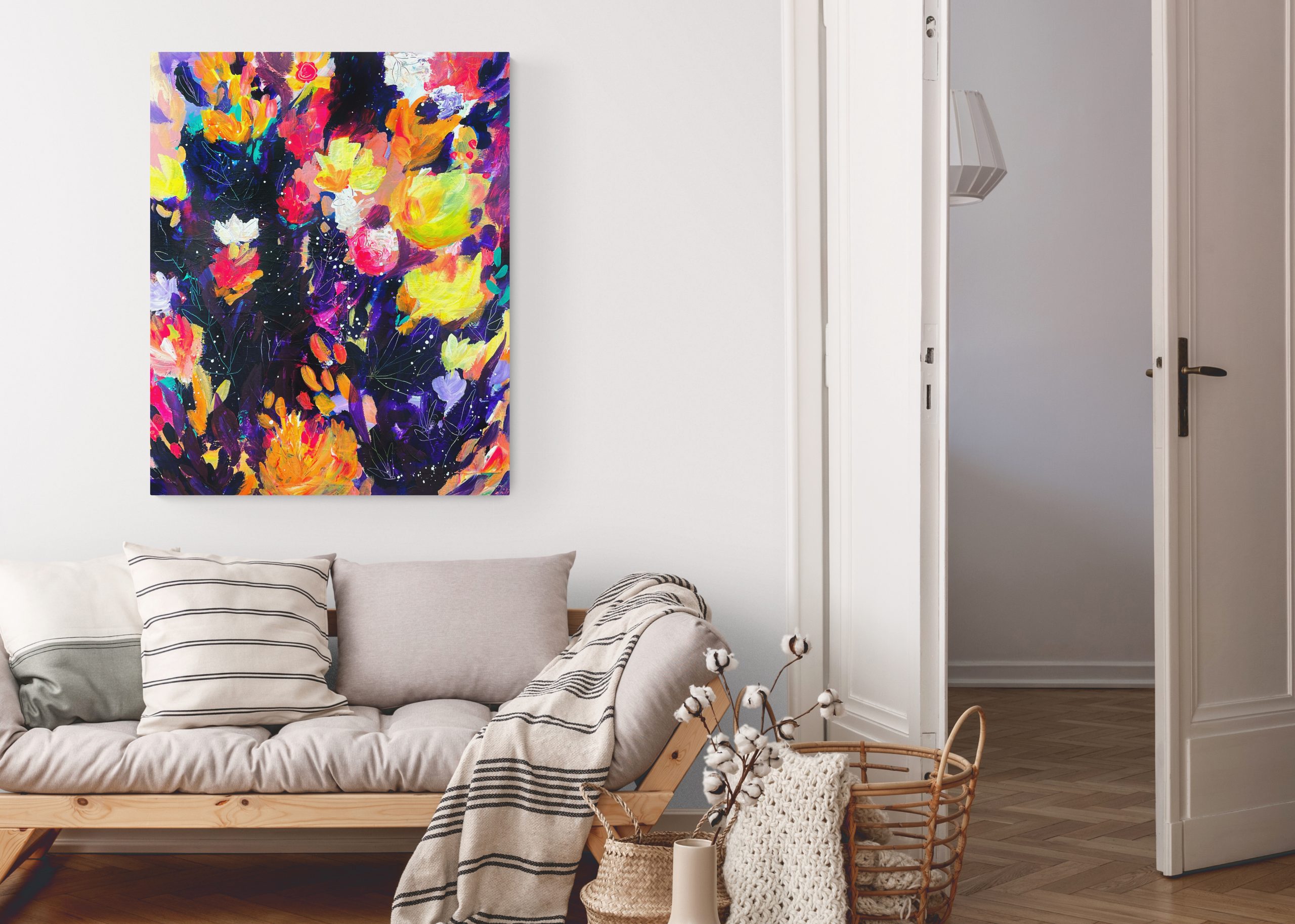 Pls note: size of painting (20 x 16″) in the image of the interior mock-up is not exactly to scale.